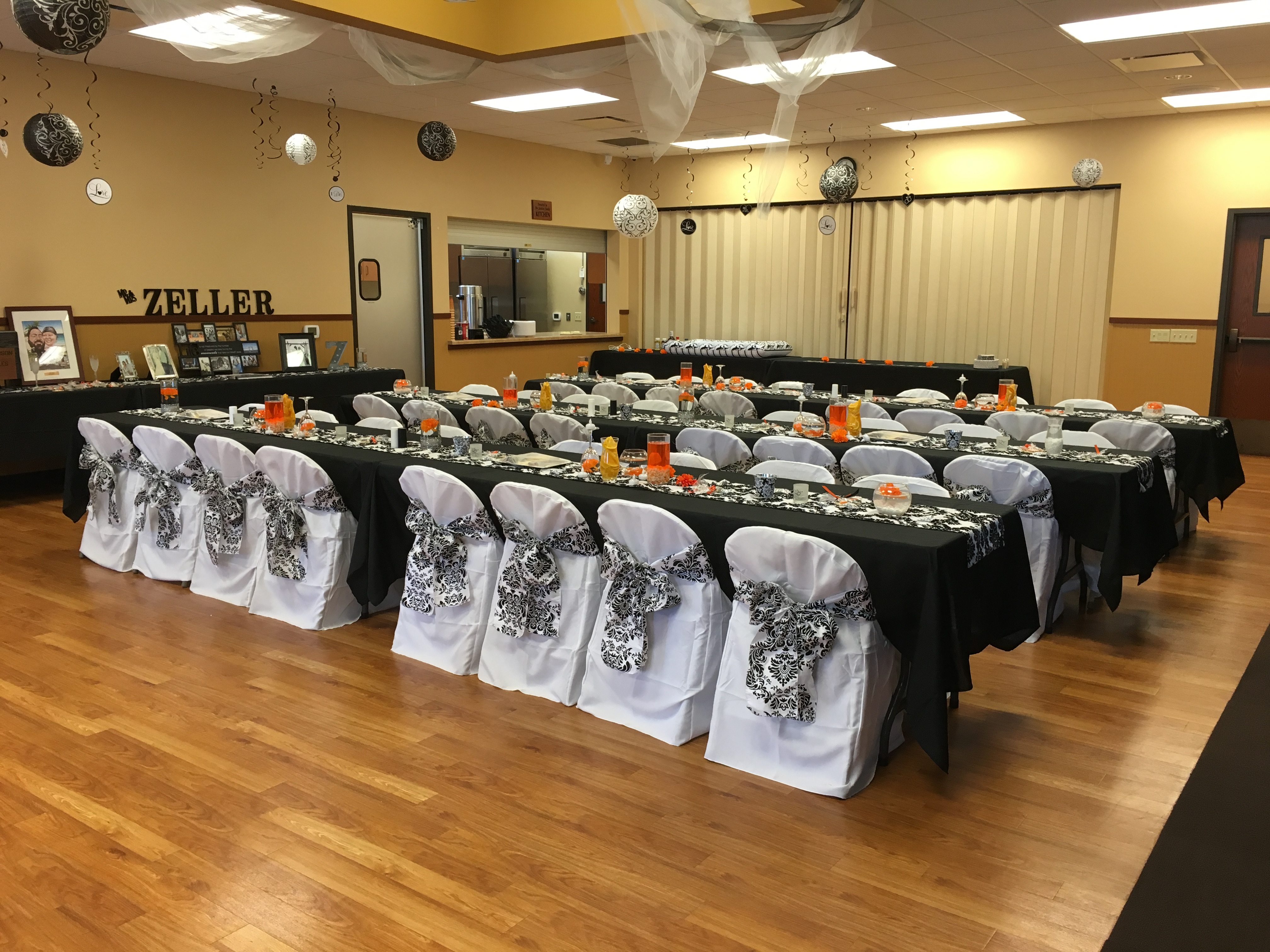 Banquet (two rows of six tables each, 8 chairs at each table, 95 total)